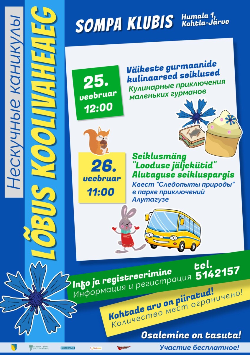 22. veebruar 2026 kell 14:00 Koht: Ahtme klubi, Kohtla-Järve, Mardi 6 Pilet: 5 € Info ja broneerimine: 5866 7113 (eelnev broneerimine kohustuslik) |