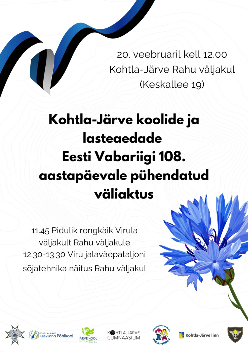 Eesti Vabariigi sünnipäeva puhul, 24. veebruaril 2026 kutsume tähistama Eesti Vabariigi 108. aastapäeva! 🕢 7:32 – Eesti lipu heiskamine 📍 Kohtla-Järve Linnavalitsuse ees 🕚 11:00 – Pärgade asetamine Vabadussõja Järve lahingu mälestussambale Kohtla-Järve linnaorkestri saatel Olete oodatud meiega koos tähistama! Heisakem sinimustvalge, naudime head seltskonda ja ühist rõõmu ning meenutame teekonda, mis meid vabaduseni viis. |