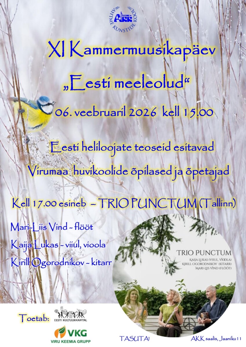 Ahtme Kunstide Kool kutsub XI Kammermuusikapäevale “Eesti meeleolud”! 6. veebruaril 2026 kell 15:00 Ahtme Kunstide Kooli saalis (Jaaniku 11). |