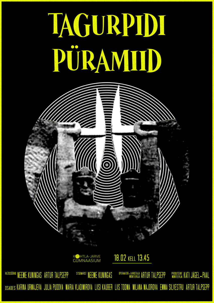 Asukoht: Kohtla-Järve Gümnaasium, Pärna 47 Kuupäev: 18. veebruar Kellaaeg: 13:45-14:30 Tule ja ela kaasa Kohtla-Järve Gümnaasiumi 6. lennu poolt loodud filmile “Tagurpidi püramiid”. Sündmus on TASUTA!
