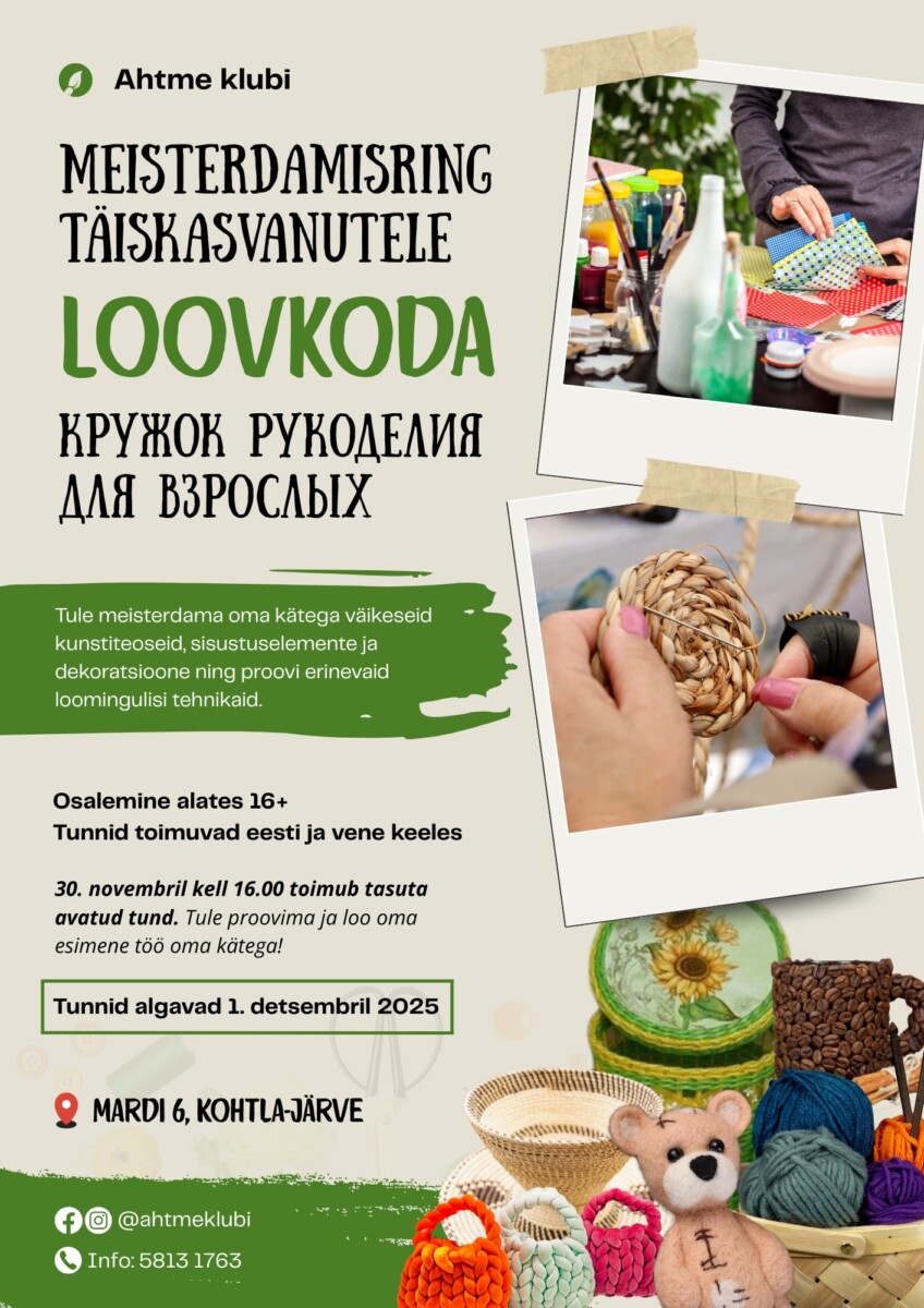 Millal: 15. november 2025 Kellaaeg: 18:00–19:30 Kus: Ahtme klubi, Kohtla-Järve, Mardi 6 Osalustasu: 10 € inimese kohta Vanus: 16+ |