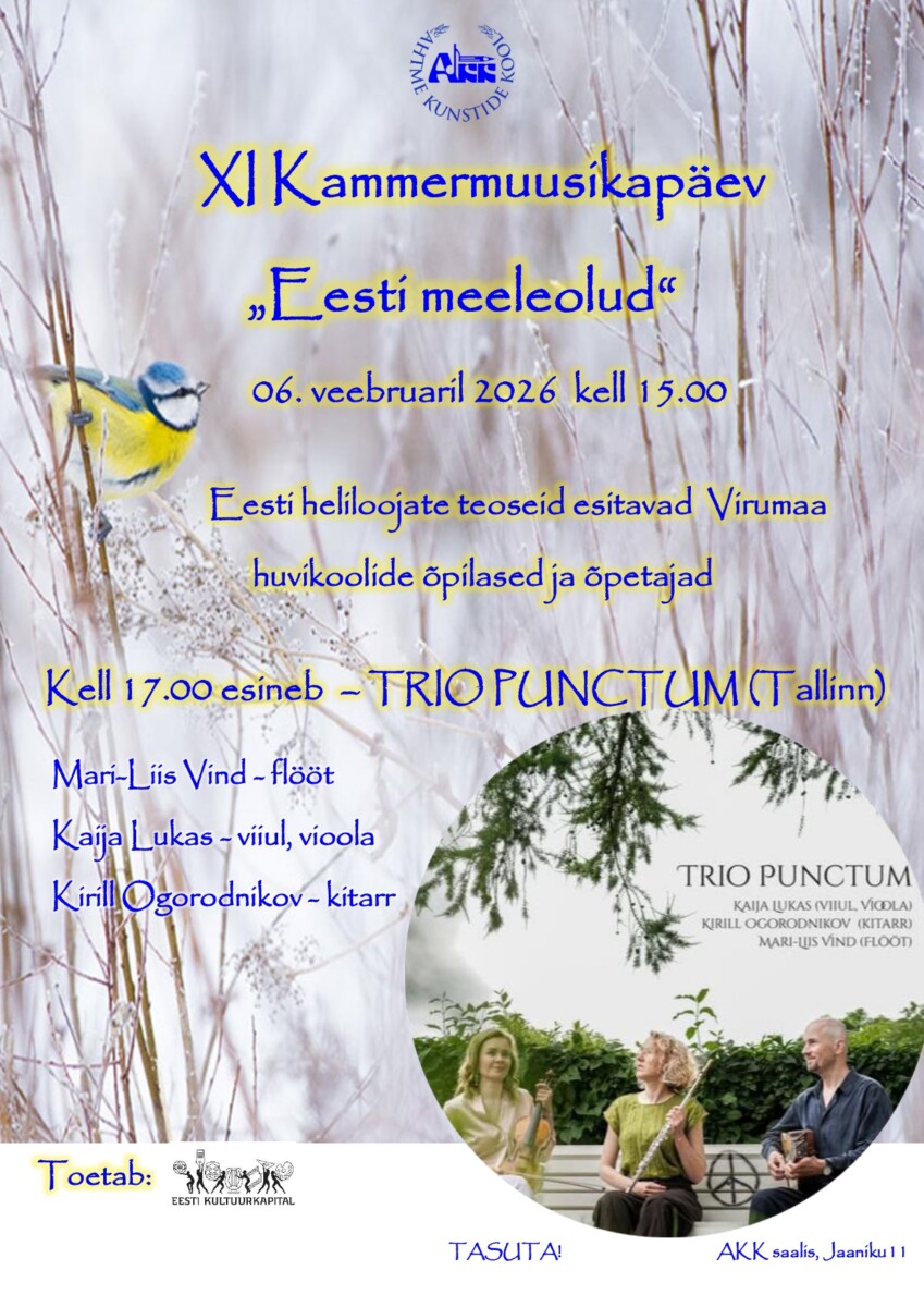 Школа искусств Ахтме Яанику 11, Кохтла-Ярве, Ида-Вирумаа, ЭстонияAhtme Kunstide Kool kutsub XI Kammermuusikapäevale “Eesti meeleolud”! 6. veebruaril 2026 kell 15:00 Ahtme Kunstide Kooli saalis (Jaaniku 11).