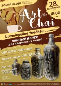 Kõik ART & CHAI õhtud toimuvad alati sõbralikus ja inspireerivas õhkkonnas, kus kohtuvad loomehinged ja head mõtted! Sel korral ootab osalejaid tutvus ART DECO stiiliga. Koos kunstnikuga Jurate Kastritskaja loome pape-art tehnikas stiilse vaasi. Selle tehnika peamine materjal on paber, kuid loova inimese käes võib see võtta mis tahes kuju – õrnadest voldikestest kuni julgete reljeefideni.