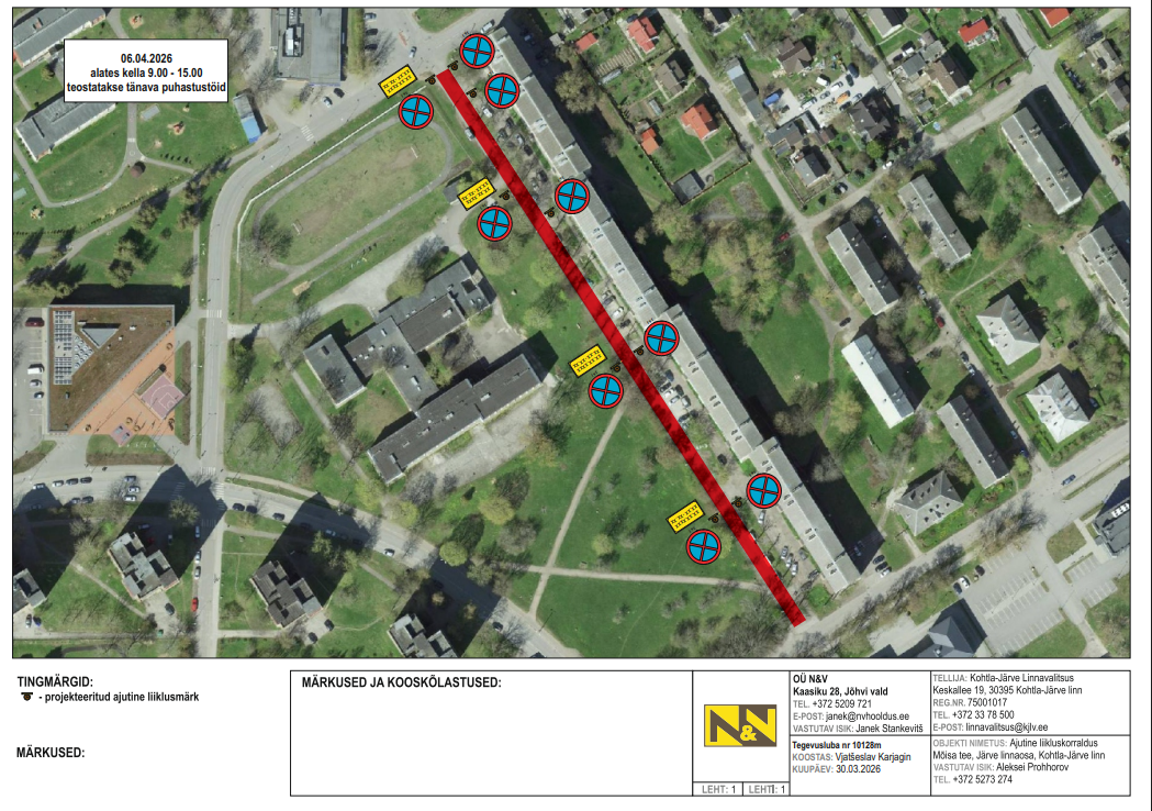 Kohtla-Järve Linnavalitsus annab teada, et meie lepingupartner hakkab teostama Mõisa tee, Ravi tänava ja Pärna tänava ümbruses tänavapuhastuse töid 06.04.2026. a alates 9.00-15.00 vastavalt skeemile.