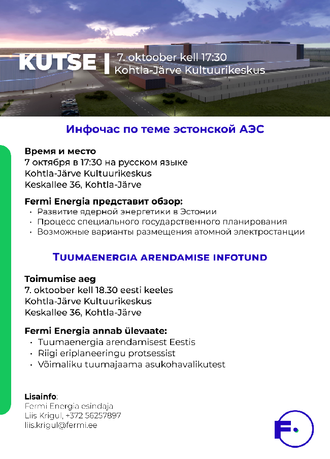 Fermi Energia ootab kõiki huvilisi tuumaenergia arendamise infotundi teisipäeval, 7. oktoobril kell 17.30 (vene keeles) ja 18.30 (eesti keeles) Kohtla-Järve Kultuurikeskuses (Keskallee 36, Kohtla-Järve).