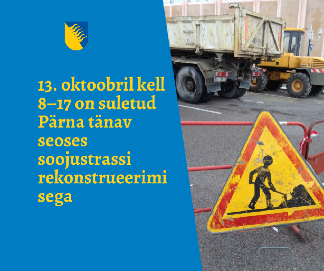 13. oktoobril kell 8–17 on suletud Pärna tänav seoses soojustrassi rekonstrueerimisega