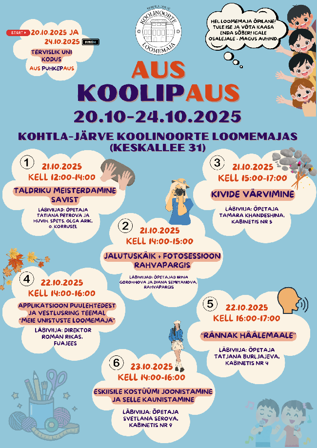Täna, 15.10.25 on järgmiste haridustoetuste taotlemise tähtaeg: Kohtla-Järve linna territooriumil asuvate üldhariduskoolide, munitsipaalhuvikoolide ja kutsekeskharidust pakkuvate...