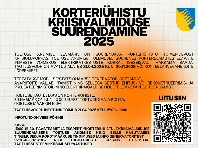 Infotund on veebipõhine ja sellele pääseb ligi siit: https://www.rtk.ee/korteriuhistule-kriisivalmiduse-suurendamine-2025